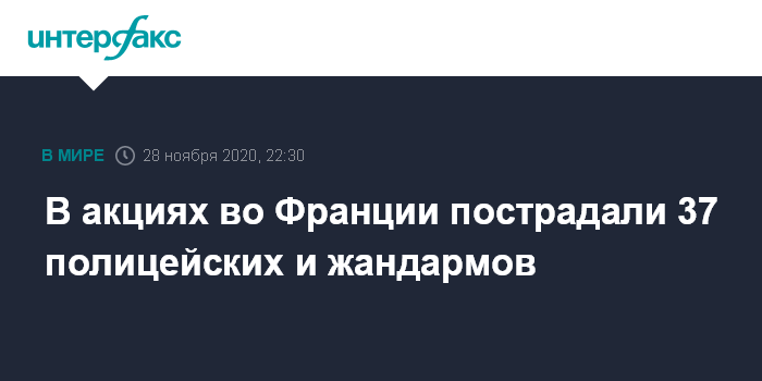 Москва. 28 ноября. INTERFAX.RU - В ходе протестных акций против закона "О глобальной безопасности", проходивших в субботу в 70 французских городах, 37 полицейских и жандармов получили ранения, сообщил телеканал BFMTV со ссылкой на МВД Франции.