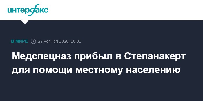 Москва. 29 ноября. INTERFAX.RU - Первые подразделения медицинского отряда специального назначения (МОСН) Восточного военного округа прибыли в столицу Нагорного Карабаха Степанакерт для оказания помощи местному населению, сообщило в воскресенье Минобороны России.