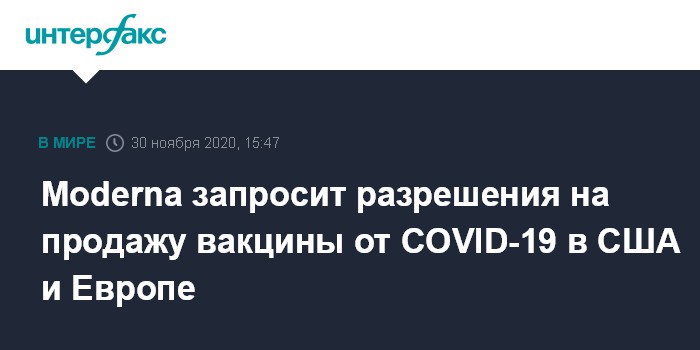 Москва. 30 ноября. INTERFAX.RU - Американская компания Moderna сообщила, что уже 30 ноября направит запрос в Управление по санитарному надзору США (FDA) и Европейское агентство лекарственных средств (EMA) о разрешении экстренно использовать свою вакцину от коронавируса.