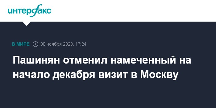 Москва. 30 ноября. INTERFAX.RU - Премьер-министр Армении Никол Пашинян не поедет в Москву в начале декабря, сообщили "Интерфаксу" в правительстве страны.