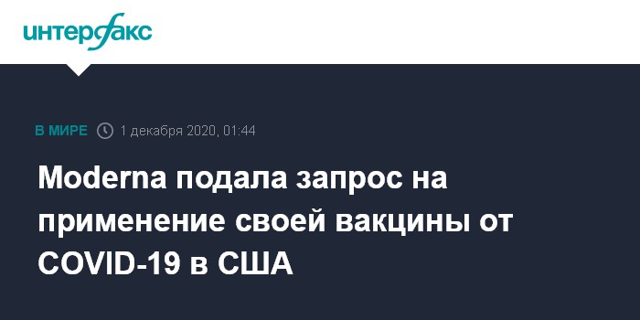 Москва. 1 декабря. INTERFAX.RU - Американская компания Moderna сообщила, что направила запрос в Управление по санитарному надзору США (FDA) для получения разрешения на экстренное использование вакцины от коронавируса COVID-19.
