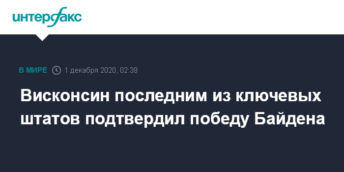 Bloomberg напоминает, что Висконсин стал последним из ключевых штатов, подтвердившим победу Байдена. Аризона официально объявила о победе демократа несколькими часами ранее. Пенсильвания, Мичиган и Невада признали Байдена победителем на прошлой неделе, Джорджия - 20 ноября.