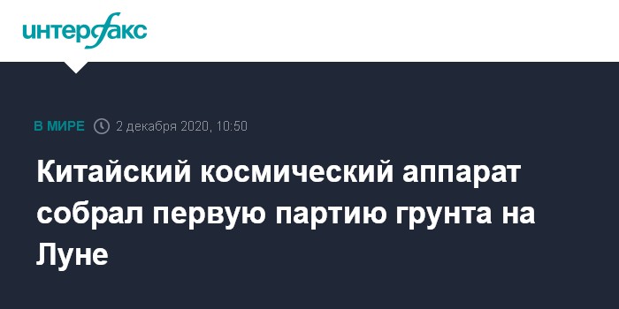 Москва. 2 декабря. INTERFAX.RU - Посадочный модуль китайской автоматической станции "Чанъэ-5" в среду, успешно пробурив грунт Луны на глубину два метра, поднял образцы геологической породы и запаковал их в контейнер для предстоящей отправки на Землю, сообщило Национальное космическое управление Китая (CNSA).