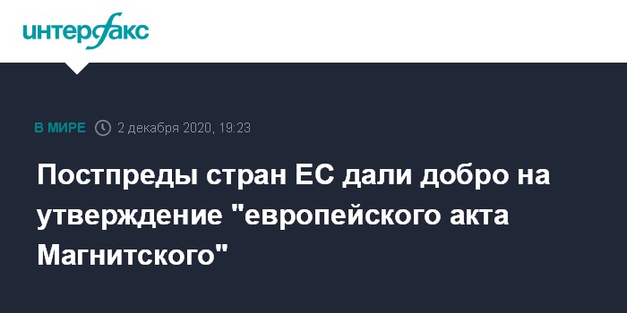 Москва. 2 декабря. INTERFAX.RU - Комитет постоянных представителей (Coreper) стран ЕС дал в среду добро на решение Совета ЕС и законодательный акт по "ограничительным мерам за серьезные нарушения и злоупотребления в области прав человека", сообщил журналист радио "Свободная Европа" Рикард Йозвяк.