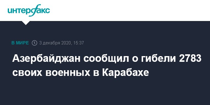 Москва. 3 декабря. INTERFAX.RU - Потери Азербайджана в ходе военных действий в зоне нагорно-карабахского конфликта с 27 сентября составили 2783 военнослужащих убитыми, сообщило министерство обороны страны.