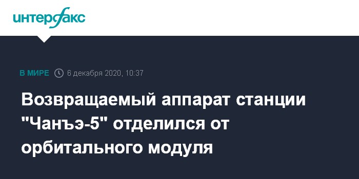Москва. 6 декабря. INTERFAX.RU - Возвращаемый аппарат китайской автоматической станции "Чанъэ-5" с пробами грунта Луны, отделившись в воскресенье в 07:35 по Москве от орбитального модуля, готовится к полету к Земле, сообщило Национальное космическое управление Китая (CNSA).