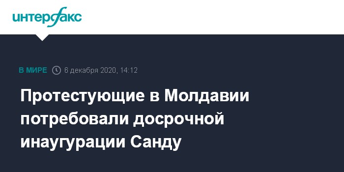 Москва. 6 декабря. INTERFAX.RU - Участники акции протеста в Молдавии потребовали, чтобы избранный президент Майя Санду вступила в должность раньше намеченного срока, передает в воскресенье корреспондент "Интерфакса".