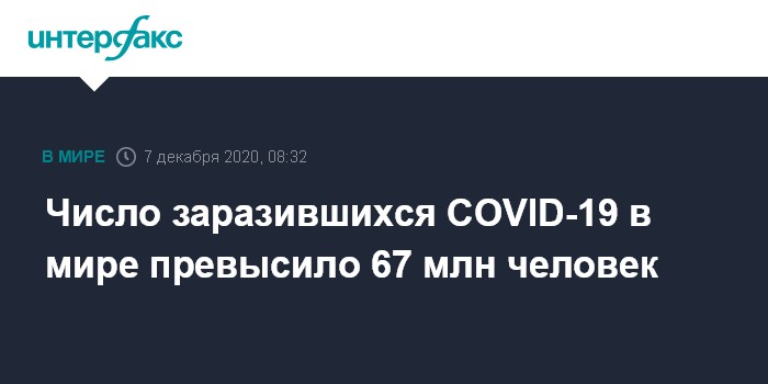 Москва. 7 декабря. INTERFAX.RU - Число выявленных случаев заражения COVID-19 в мире с начала пандемии достигло на 8:00 по Москве понедельника 67 063 428 случаев, свидетельствуют данные американского университета Джонса Хопкинса.