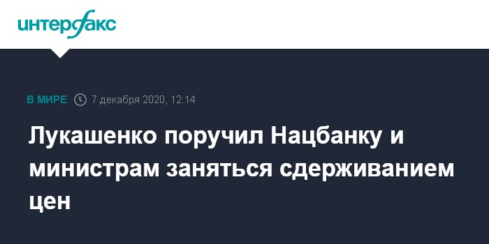 Москва. 7 декабря. INTERFAX.RU - Президент Белоруссии Александр Лукашенко поручил правительству и Нацбанку разработать механизм общего сдерживания цен, "по всем направлениям и параметрам", передает "БелТА".