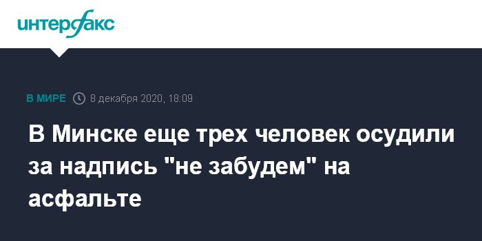 Москва. 8 декабря. INTERFAX.RU - Суд Фрунзенского района Минска осудил еще троих человек по уголовному делу за обновление 9 сентября надписи "Не забудем!" возле народного мемориала, посвященного убитому протестующему Александру Тарайковскому.