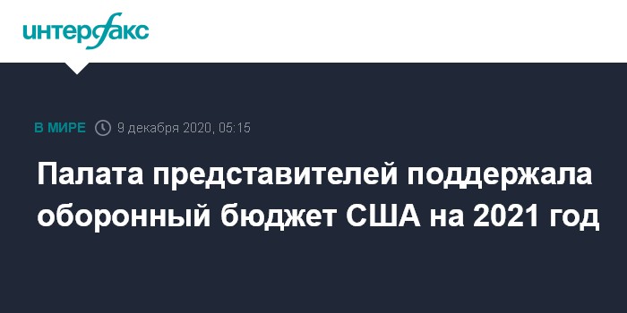 Москва. 9 декабря. INTERFAX.RU - Члены Палаты представителей США во вторник большинством голосов поддержали законопроект об оборонном бюджете на финансовый 2021 год.