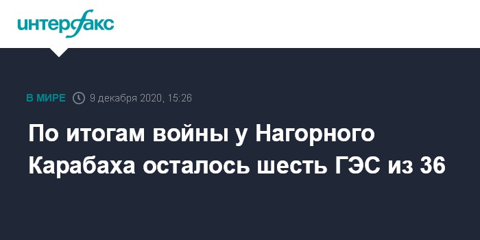 Москва. 9 декабря. INTERFAX.RU - По итогам войны в Нагорном Карабахе 30 из 36 действующих гидроэлектростанций (ГЭС) перешли под контроль Азербайджана, заявил начальник отдела энергетики министерства экономики и производственных инфраструктур непризнанной Нагорно-Карабахской республики (НКР) Левон Габриелян.