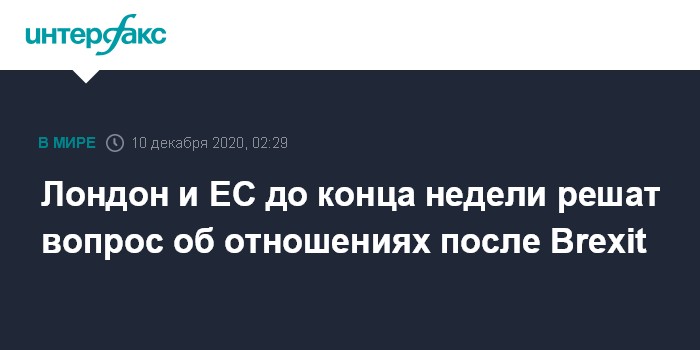Москва. 10 декабря. INTERFAX.RU - Председатель Еврокомиссии (ЕК) Урсула фон дер Ляйен констатировала расхождение позиций ЕС и Великобритании по вопросу о будущем их отношений после Brexit, решение по этому вопросу будет принято до конца текущей недели.
