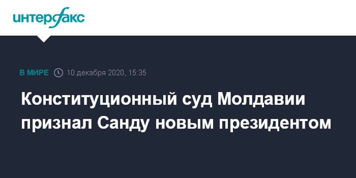 Москва. 10 декабря. INTERFAX.RU - Председатель Конституционного суда Молдавии Домника Маноле объявила Майю Санду новым президентом Молдавии после того, как КС утвердил в четверг результаты президентских выборов.