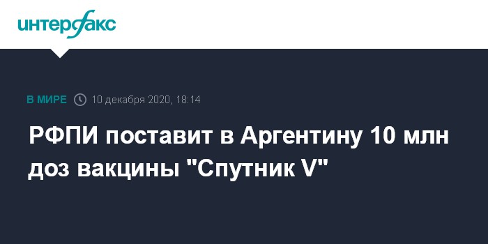 Москва. 10 декабря. INTERFAX.RU - Российский фонд прямых инвестиций (РФПИ) передаст 10 млн доз вакцины "Спутник V" в Аргентину, говорится в сообщении в твиттер-аккаунте российской вакцины в четверг.