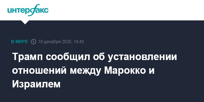 Москва. 10 декабря. INTERFAX.RU - Президент США Дональд Трамп сообщил об установлении дипломатических отношений между Марокко и Израилем.