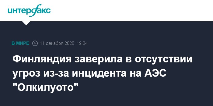 Москва. 11 декабря. INTERFAX.RU - Центр радиационной безопасности Финляндии (STUK) передал в МАГАТЭ информацию о происшествии 10 декабря на втором энергоблоке АЭС "Олкилуото" и об отсутствии опасности в результате этого инцидента, говорится в пресс-релизе МАГАТЭ.