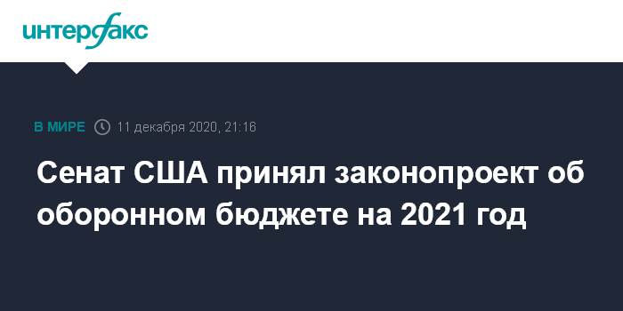 Москва. 11 декабря. INTERFAX.RU - Сенат Конгресса США в пятницу проголосовал за законопроект об оборонном бюджете на финансовый 2021 год.