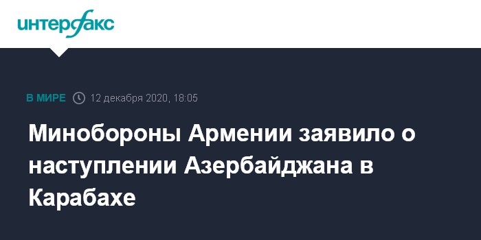 Москва. 12 декабря. INTERFAX.RU - Вооруженные силы Азербайджана вечером 12 декабря предприняли наступательные действия в Нагорном Карабахе, сообщает пресс-служба Минобороны Армении.