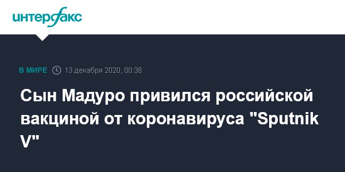 Москва. 13 декабря. INTERFAX.RU - Сын венесуэльского президента Николас Мадуро Герра в субботу, 12 декабря, принял участие в третьей фазе испытаний вакцины от коронавируса "Sputnik V", разработанной российским центром им. Гамалеи, сообщил в твиттере посол РФ в Венесуэле Сергей Мелик-Багдасаров.