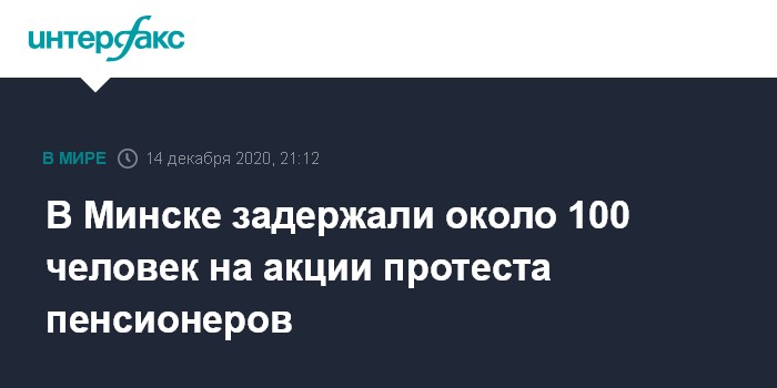 Москва. 14 декабря. INTERFAX.RU - Число задержанных на несанкционированной акции протеста пенсионеров в Минске в понедельник составило около 100 человек. Об этом свидетельствуют данные, опубликованные незарегистрированным в Белоруссии правозащитным центром "Весна".