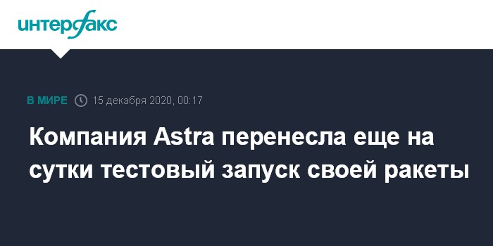 Москва. 14 декабря. INTERFAX.RU - В связи с неблагоприятными погодными условиями американская компания Astra, перенесла на сутки планировавшийся в понедельник испытательный запуск своей легкой ракеты-носителя Rocket для выведения на орбиту коммерческих грузов, сообщается на ее сайте.