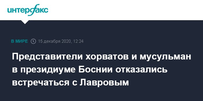 Москва. 15 декабря. INTERFAX.RU - Члены президиума Боснии и Герцеговины Желько Комшич и Шефик Джаферович, представляющие хорватскую и мусульманскую общины, отказались встречаться с главой МИД РФ Сергеем Лавровым, который находится в стране с рабочим визитом.