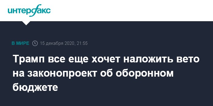 Москва. 15 декабря. INTERFAX.RU - Дональд Трамп все еще планирует попытаться наложить вето на законопроект об оборонном бюджете на 2021 финансовый год, заявила пресс-секретарь президента США Кейли Макэнани во вторник.