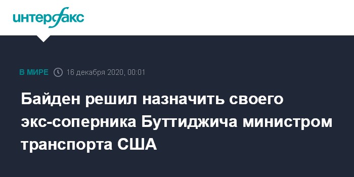 Москва. 16 декабря. INTERFAX.RU - Избранный президент США Джо Байден решил назначить Пита Буттиджича на пост главы Минтранса, сообщает телеканал NBC News со ссылкой на несколько источников.
