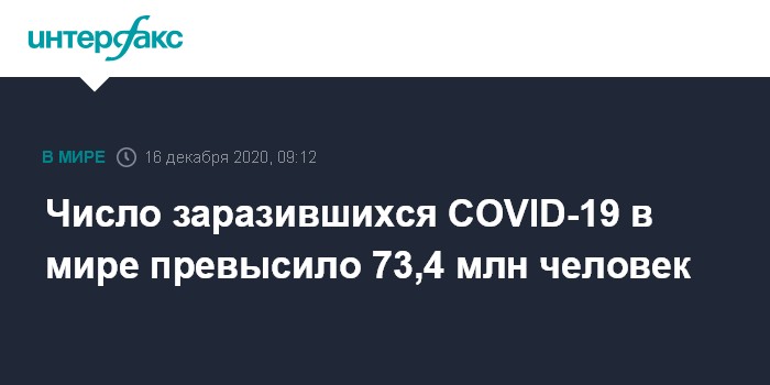 Москва. 16 декабря. INTERFAX.RU - Число выявленных случаев заражения COVID-19 в мире с начала пандемии достигло 73 463 135, свидетельствуют данные американского университета Джонса Хопкинса.