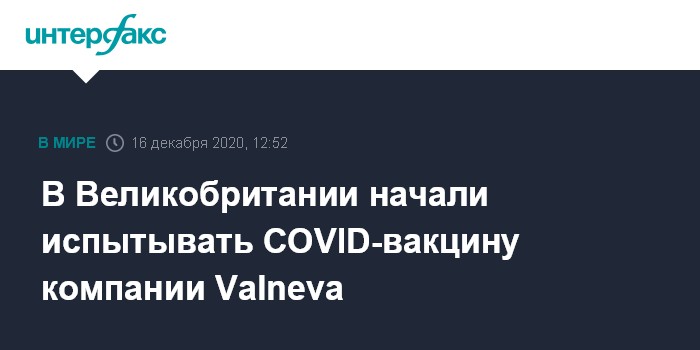 Москва. 16 декабря. INTERFAX.RU - В Великобритании стартовали клинические испытания потенциальной вакцины от коронавируса COVID-19, разработанной в Шотландии компанией Valneva SE, сообщил в среду телеканал Sky News со ссылкой на британского министра бизнеса Алока Шарму.