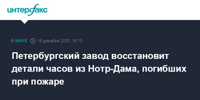 Москва. 16 декабря. INTERFAX.RU - Петербургский часовой завод "Ракета" поможет воссоздать часовой механизм Collin, управлявший четырьмя циферблатами на соборе Парижской богоматери. Механизм, сделанный в 1867 году, сгорел при пожаре в апреле 2019 года.