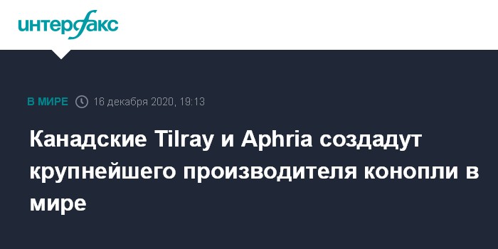 Москва. 16 декабря. INTERFAX.RU - Канадские производители конопли Tilray Inc и Aphria Inc заключили соглашение о слиянии.