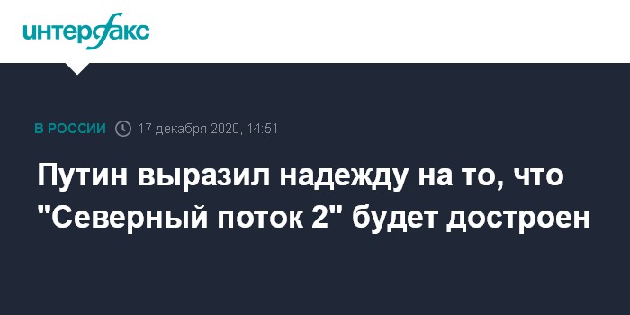 Москва. 17 декабря. INTERFAX.RU - Российская сторона надеется, что новая администрация США вернется к практике нормальной добросовестной конкуренции, сообщил президент России Владимир Путин, говоря о перспективах завершения проекта "Северный поток 2", на процесс строительства которого США пытаются повлиять через санкции.
