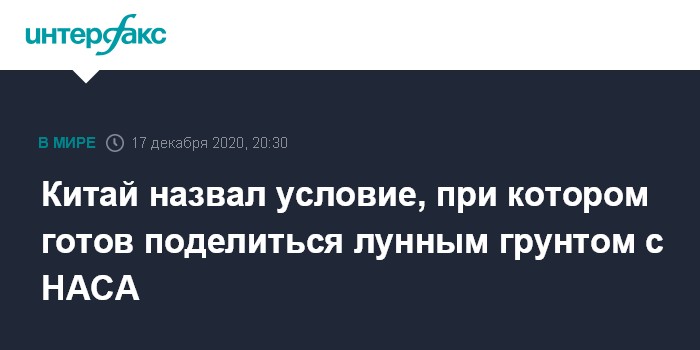 Москва. 17 декабря. INTERFAX.RU - Китай может поделиться с НАСА образцами лунного грунта, доставленными зондом "Чанъэ-5", однако для этого требуется изменение политики властей США, заявил заместитель лунной программы Китая У Яньхуа на пресс-конференции.