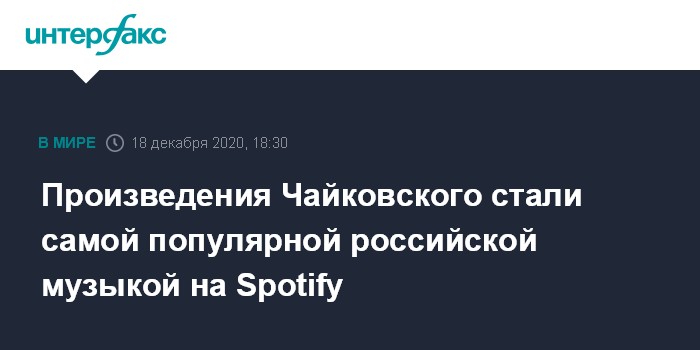 Москва. 18 декабря. INTERFAX.RU - Произведения композитора Петра Чайковского (1840-1893) возглавили топ самой популярной в мире российской музыки сервиса Spotify.