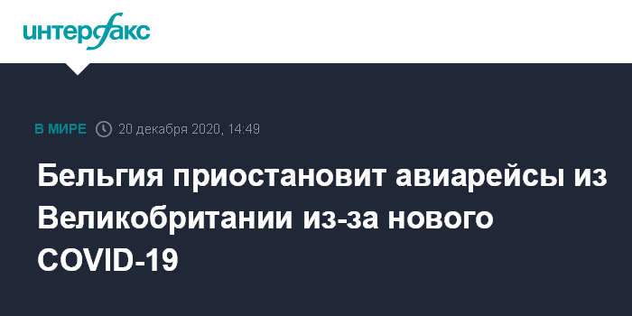 Москва. 20 декабря. INTERFAX.RU - Бельгия с полуночи воскресенья по меньшей мере на 24 часа запретит авиарейсы из Великобритании из-за обнаружения там новой разновидности коронавируса COVID-19, сообщил бельгийский премьер-министр Александр Де Кроо в эфире телеканала VRT.