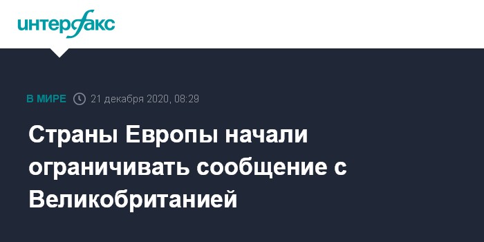Москва. 21 декабря. INTERFAX.RU - Страны Европы начали ограничивать транспортное сообщение с Великобританией, поскольку на острове быстро распространяется новый штамм COVID-19, особо контагиозный. В понедельник ожидается согласованное решение об этом на уровне Евросоюза.