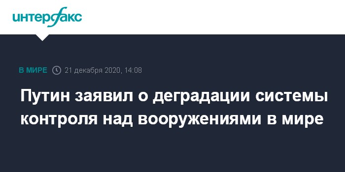 Москва. 21 декабря. INTERFAX.RU - Деградация системы контроля над вооружениями продолжается, заявил президент РФ Владимир Путин.