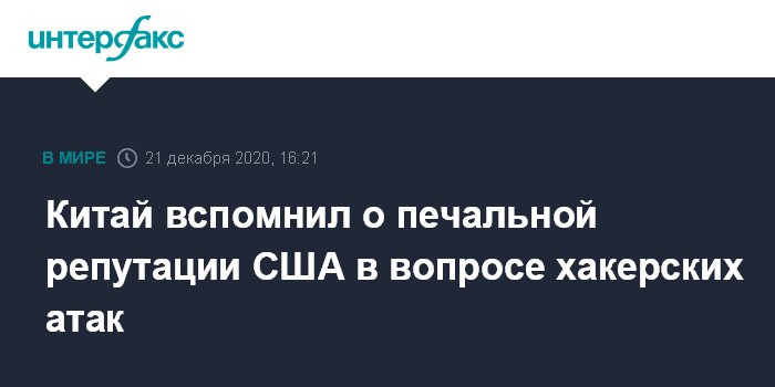 Москва. 21 декабря. INTERFAX.RU - Пекин в ответ на слова президента США Дональда Трампа о возможной ответственности Китая за недавнюю кибератаку на американские федеральные ведомства выступил против политизации вопроса интернет-безопасности, заявил на брифинге официальный представитель МИД КНР Ван Вэньбинь.
