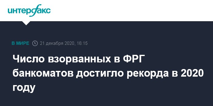 Москва. 21 декабря. INTERFAX.RU - Количество взорванных в Германии банкоматов в 2020 году превысило 400 и достигло рекорда, сообщила вице-президент Федерального ведомства по уголовным делам (BKA) Мартина Линк агентству DPA.
