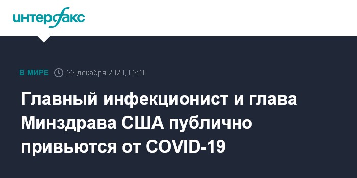 Москва. 22 декабря. INTERFAX.RU - Главный инфекционист США Энтони Фаучи и министр здравоохранения и социальных служб Алекс Азар получат коронавирусную вакцину во вторник.