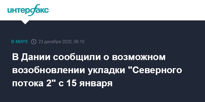 Москва. 23 декабря. INTERFAX.RU - Трубоукладочное судно под российским флагом Fortuna с 15 января 2021 года может начать укладку "Северного потока 2" в датской исключительной экономической зоне, сообщили в среду Датское агентство по мореплаванию и проектная компания Nord Stream 2 AG.