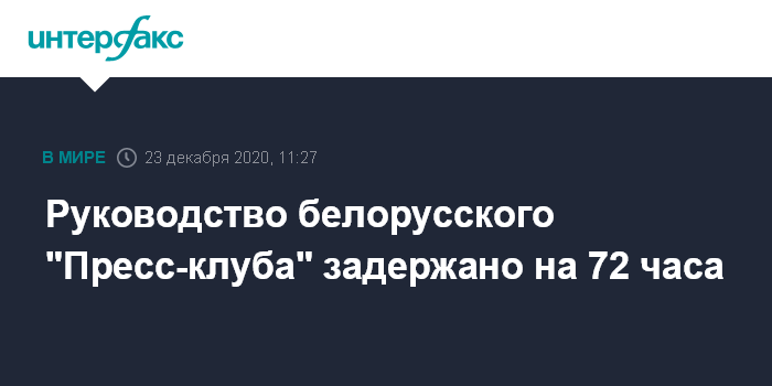 Москва. 23 декабря. INTERFAX.RU - Четверо представителей белорусского "Пресс-клуба" задержаны на 72 часа, сообщается в среду на сайте незарегистрированного в Белоруссии правозащитного центра "Весна".