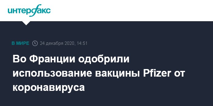 Москва. 24 декабря. INTERFAX.RU - Во Франции регулятор одобрил использование вакцины от коронавируса, разработанной компаниями Pfizer и BioNTech, говорится в сообщении на сайте регулятора.