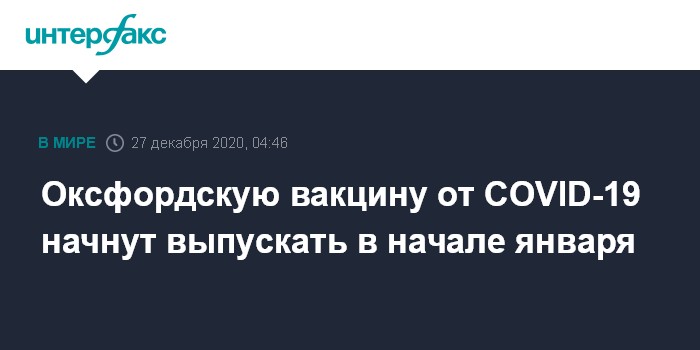 Москва. 27 декабря. INTERFAX.RU - Выпуск вакцины от коронавируса, разработанной Оксфордским университетом, может начаться 4 января, сообщает издание The Sunday Telegraph.