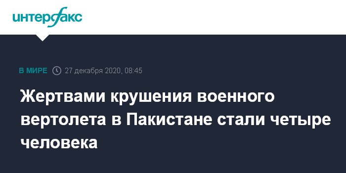 Москва. 27 декабря. INTERFAX.RU - Вертолет пакистанской армии разбился ночью при выполнении спасательной операции, погибли находившиеся на борту четыре человека: первый и второй пилоты вертолета, а также два солдата, сообщили военные в воскресенье.