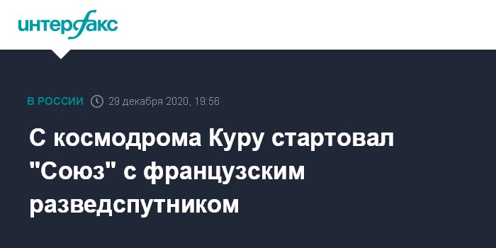 Москва. 29 декабря. INTERFAX.RU - Российская ракета-носитель "Союз" во вторник успешно стартовала на орбиту с космодрома Куру в Южной Америке с французским разведывательным спутником CSO-2, сообщила компания-оператор запуска Arianespace.