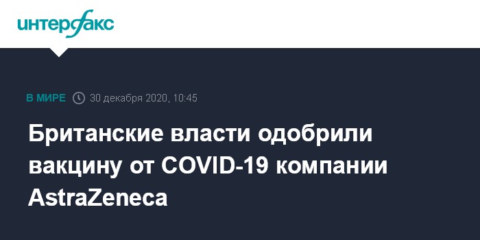 Москва. 30 декабря. INTERFAX.RU - Агентство по контролю лекарственных препаратов Великобритании (MHRA) в среду одобрило экстренное применение вакцины от коронавируса COVID-19 англо-шведской AstraZeneca, говорится в заявлении компании.