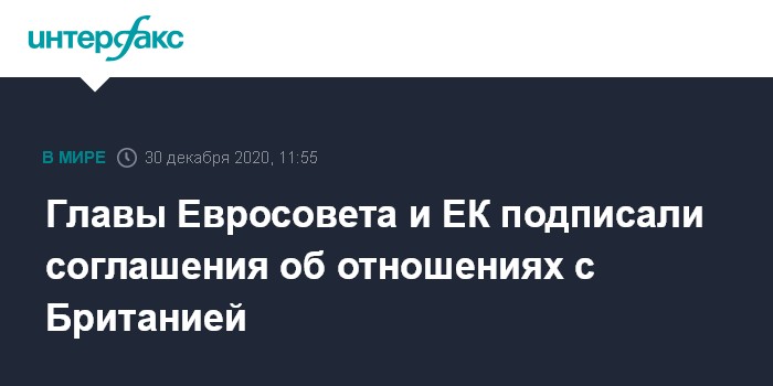 Москва. 30 декабря. INTERFAX.RU - Председатель Европейского совета Шарль Мишель и председатель Еврокомиссии Урсула фон дер Ляйен подписали в среду в Брюсселе от имени Евросоюза три соглашения, связанные с отношениями ЕС и Великобритании после Brexit.